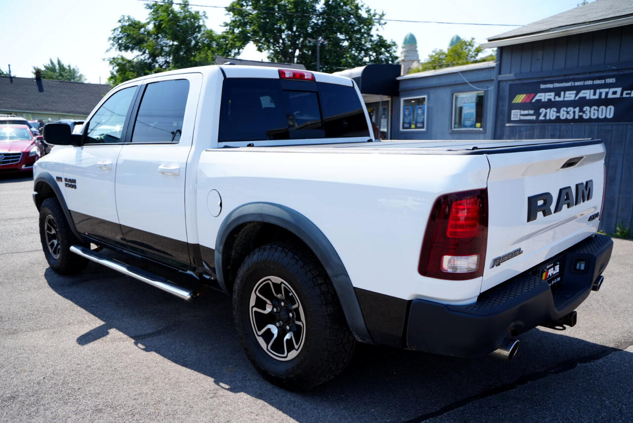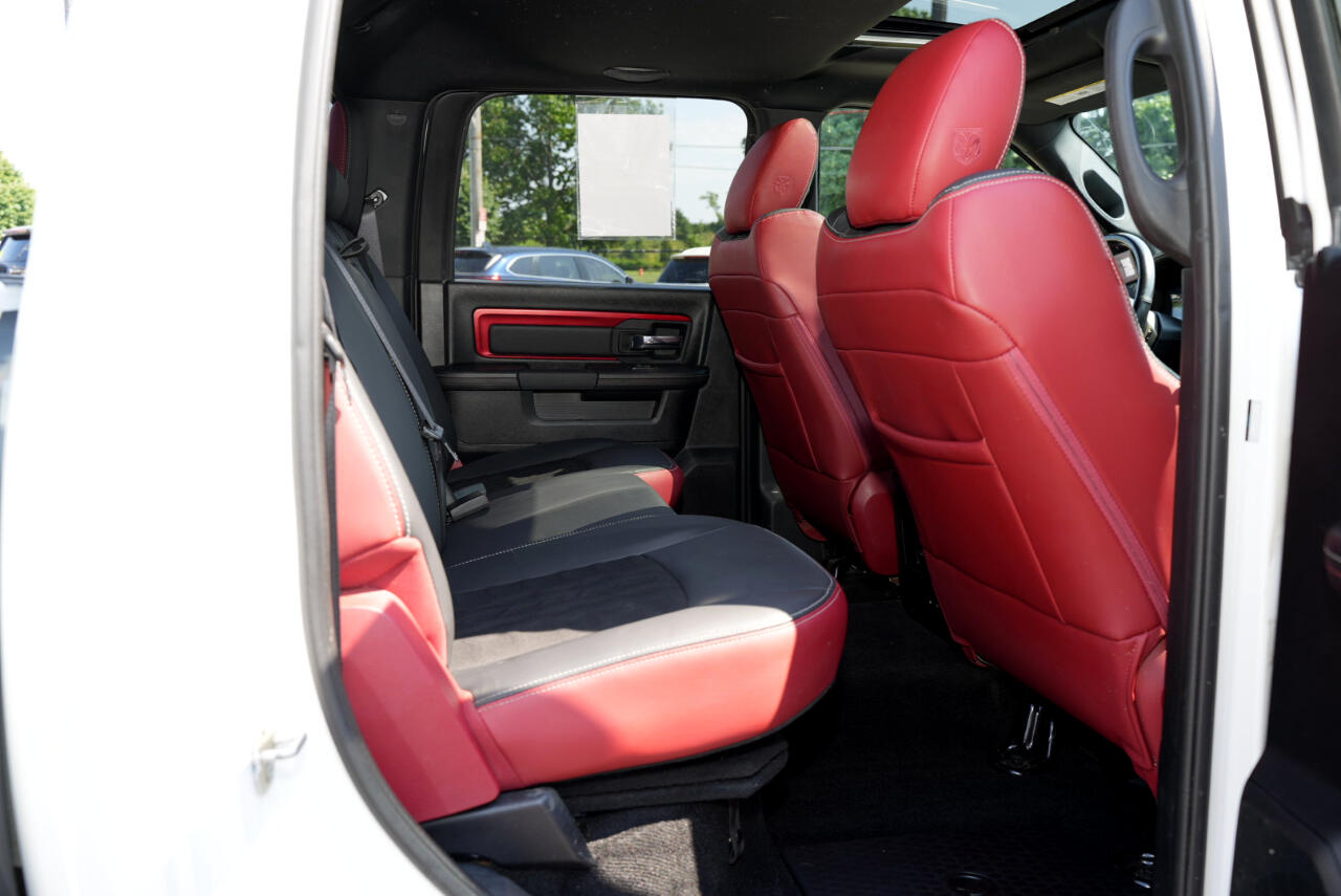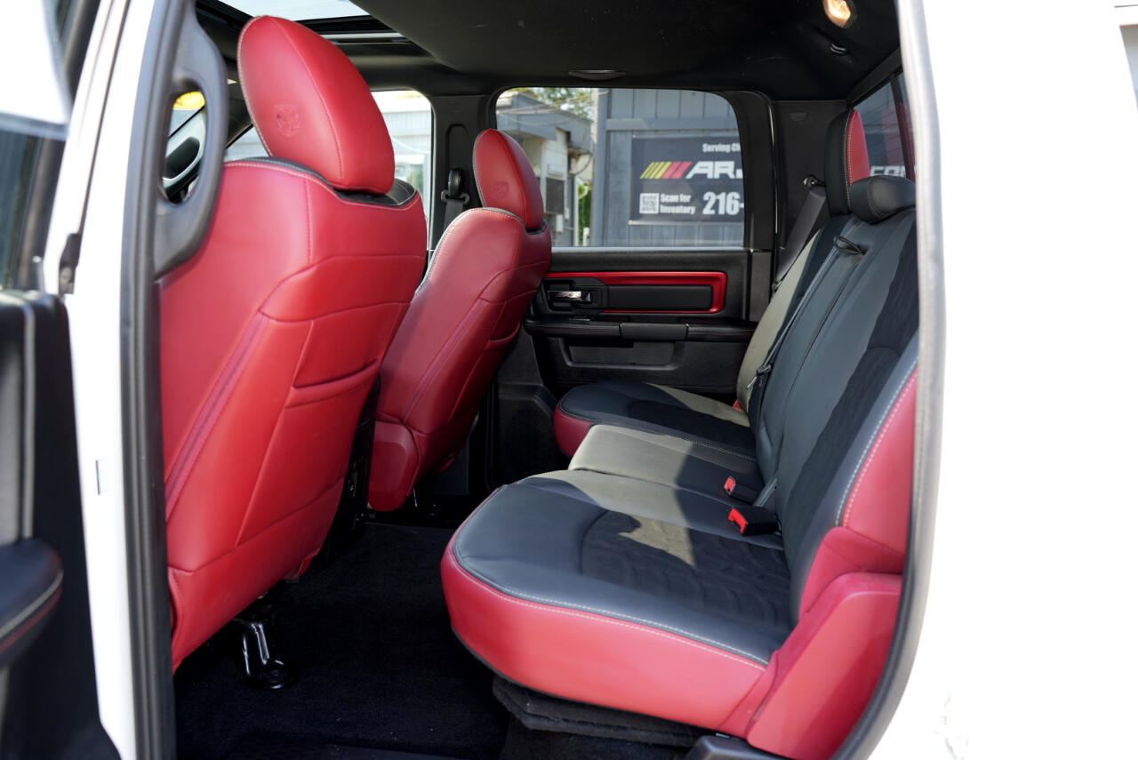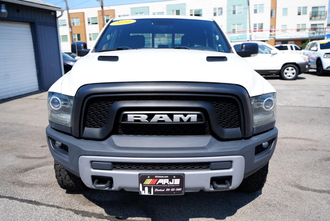 ARJ'S AUTO SALES IS PROUD TO PRESENT THIS AMAZING 2016 DODGE RAM 1500 CREW CAB REBEL 4X4. CLEAN CARFAX HISTORY WITH 21 SERVICE RECORDS! THE BRIGHT WHITE METALLIC EXTERIOR IS ACCENTED WITH BLACK LOWER PAINT & OPENS TO A WELL FEATURED TWO TONE RED/BLACK LEATHER INTERIOR WITH FOLD UP SECOND ROW SEATS AND SPECIAL EMBROIDERY. EQUIPPED WITH A HUGE TOUCHSCREEN NAVIGATION SYSTEM WITH CONTROLS FOR AUDIO, BLUETOOTH AND CLIMATE, NAVIGATION, REAR CAMERA, HEATED CUSTOM SEATS, HEATED STEERING WHEEL, KEYLESS ENTRY WITH REMOTE START, MOONROOF, POWER SLIDING REAR WINDOW,POWER WINDOWS, LOCKS AND MIRRORS, CD, AND CRUISE. THE 5.7L V-8 HEMI CAN HANDLE JOBS WITH EASE PAIRED WITH THE TOW PACKAGE AND DRIVER SELECTABLE 4WD. THE SHARP BLACK SPORT MAGS ROCK OFF-ROAD TOYO TIRES PAIRED WITH AN ADJUSTABLE POWER SUSPENSION AT THE TOUCH OF A BUTTON. SOFT TONNEAU COVER AND BED LINER ARE INCLUDED AS WELL. GREAT VALUE ON A LOADED 4X4!