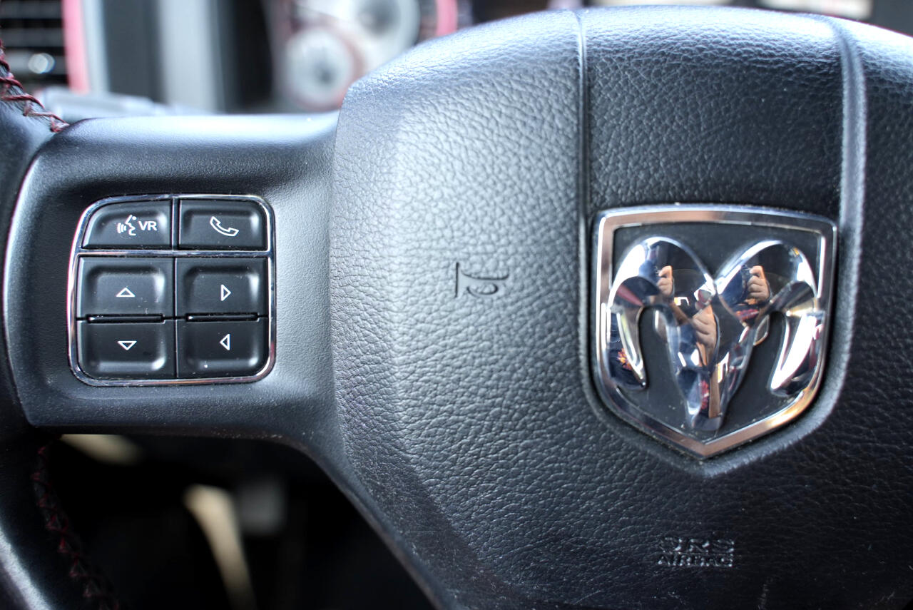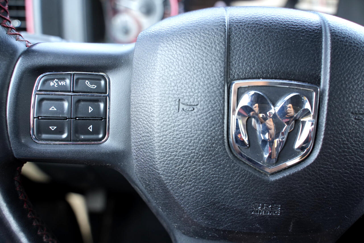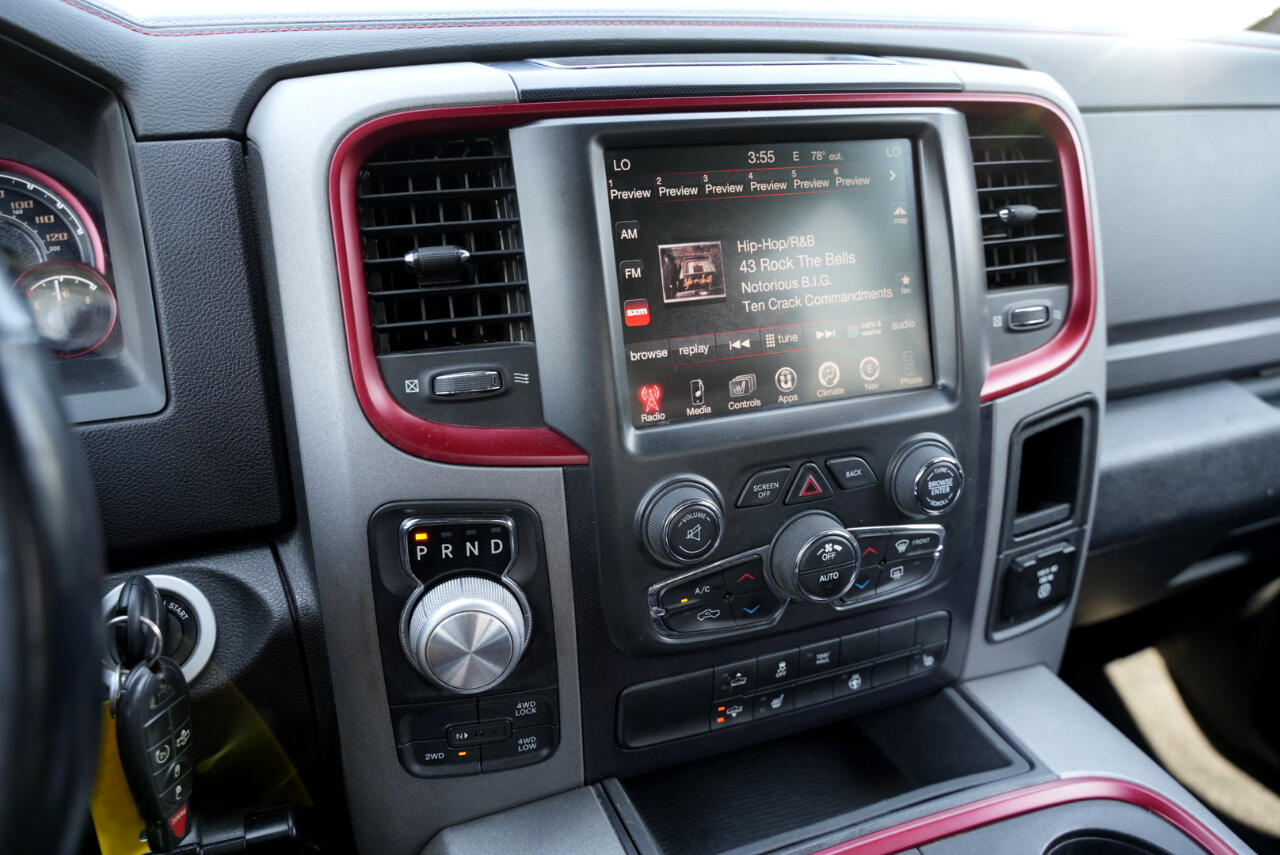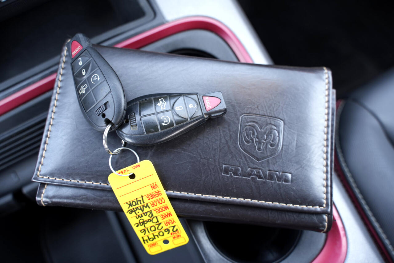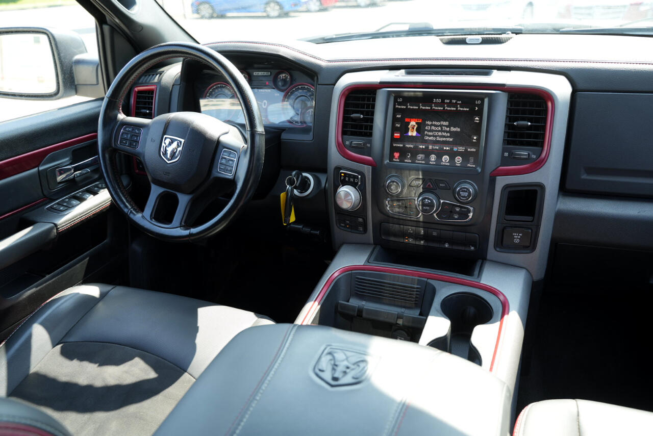 ARJ'S AUTO SALES IS PROUD TO PRESENT THIS AMAZING 2016 DODGE RAM 1500 CREW CAB REBEL 4X4. CLEAN CARFAX HISTORY WITH 21 SERVICE RECORDS! THE BRIGHT WHITE METALLIC EXTERIOR IS ACCENTED WITH BLACK LOWER PAINT & OPENS TO A WELL FEATURED TWO TONE RED/BLACK LEATHER INTERIOR WITH FOLD UP SECOND ROW SEATS AND SPECIAL EMBROIDERY. EQUIPPED WITH A HUGE TOUCHSCREEN NAVIGATION SYSTEM WITH CONTROLS FOR AUDIO, BLUETOOTH AND CLIMATE, NAVIGATION, REAR CAMERA, HEATED CUSTOM SEATS, HEATED STEERING WHEEL, KEYLESS ENTRY WITH REMOTE START, MOONROOF, POWER SLIDING REAR WINDOW,POWER WINDOWS, LOCKS AND MIRRORS, CD, AND CRUISE. THE 5.7L V-8 HEMI CAN HANDLE JOBS WITH EASE PAIRED WITH THE TOW PACKAGE AND DRIVER SELECTABLE 4WD. THE SHARP BLACK SPORT MAGS ROCK OFF-ROAD TOYO TIRES PAIRED WITH AN ADJUSTABLE POWER SUSPENSION AT THE TOUCH OF A BUTTON. SOFT TONNEAU COVER AND BED LINER ARE INCLUDED AS WELL. GREAT VALUE ON A LOADED 4X4!