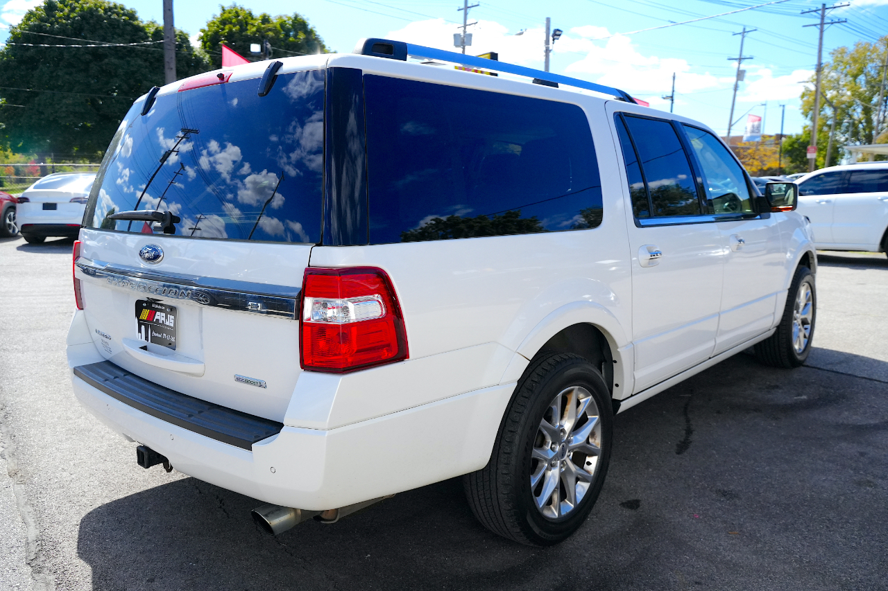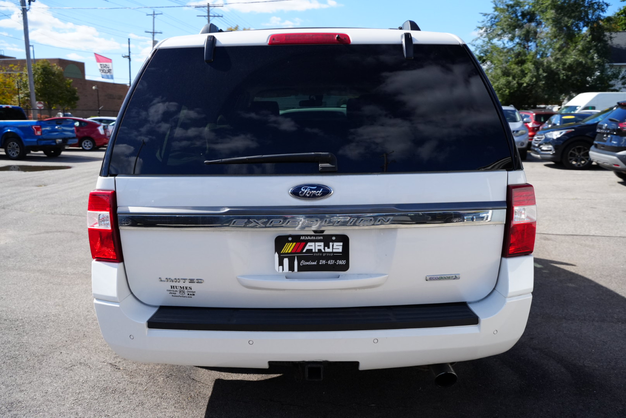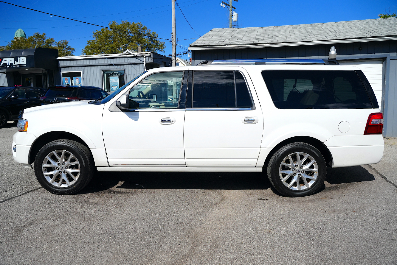 ARJ'S AUTO SALES IS PROUD TO PRESENT THIS 2015 FORD EXPEDITION LIMITED EL 4WD. WELL MAINTAINED WITH 31 SERVICE RECORDS CARFAX HISTORY. THE EXTERIOR IS WHITE PLATINUM METALLIC TRI-COAT. A VERY WELL EQUIPPED AND SPACIOUS DUNE LEATHER INTERIOR IS FOUND INSIDE. A MOONROOF, NAVIGATION SYSTEM, REAR CAMERA WITH REVERSE SENSING, BLIND SPOT ALERT, REAR HEADREST DVD ENTERTAINMENT WITH REMOTES, TRIPLE ZONE CLIMATE CONTROL, PREMIUM SONY AUDIO FEATURING CD/XM SATELLITE RADIO, POWER REAR LIFT GATE, HEATED/COOLED FRONT SEATS, HEATED REAR SEATS, HEATED MIRRORS, REMOTE START, AND STEERING WHEEL CONTROLS FOR THE STEREO ARE FOUND IN THE LEATHER AND WOOD GRAIN INTERIOR. THREE ROWS OF SEATS THAT CAN BE CONFIGURED FOR PEOPLE OR CARGO WITH A POWER FOLDING THIRD ROW. WITH A 3.5L V-6 AND SELECTABLE 4WD, THIS EXPEDITION IS READY FOR YOU! BRUSHED ALUMINIUM WHEELS HAVE NEW GOODYEAR-EAGLE TIRES ON THEM PAIRED WITH POWER RETRACTABLE RUNNING BOARDS. A TOW PACKAGE IS INCLUDED AS WELL. GREAT VALUE ON A GREAT FAMILY VEHICLE!